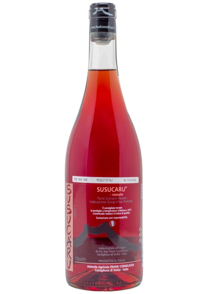 The Frank Cornelissen Susucaru Rosato is a distinctive wine that combines the refreshing qualities of a rosé with the depth and complexity of a light red. Produced with a unique philosophy, the wine undergoes skin contact for added texture and an expression of its volcanic terroir, while malolactic fermentation is fully completed to ensure both density and stability. The blend of Malvasia, Moscadella, Insolia, and Nerello Mascalese comes from the high-altitude vineyards on Mount Etna, creating a wine that is both fresh and versatile. Often described as a benchmark for summer wines, the Susucaru Rosato is a cult classic, perfect for those who appreciate a wine that can pair effortlessly with a wide range of dishes, from seafood to light meats.